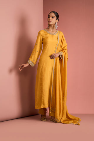 Floral Yoke Design Chanderi Silk A-Line Kurta With Trousers & Dupatta