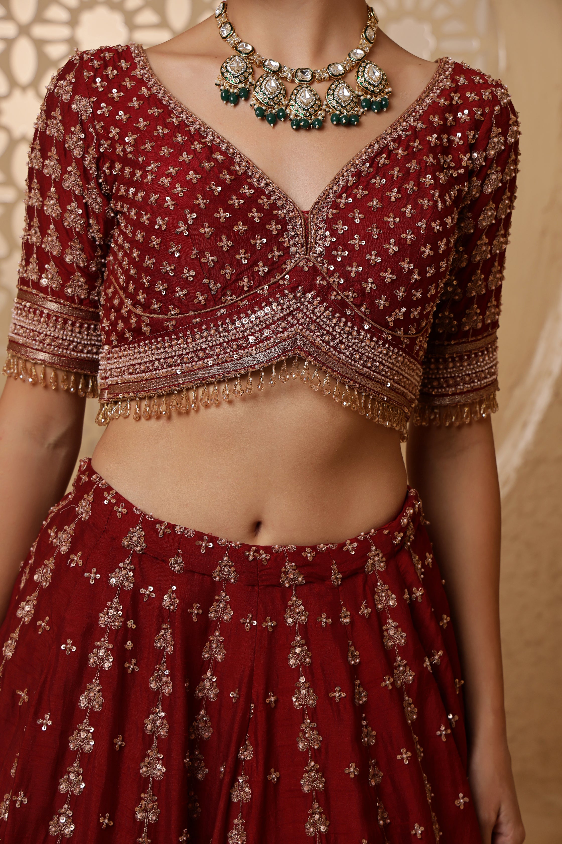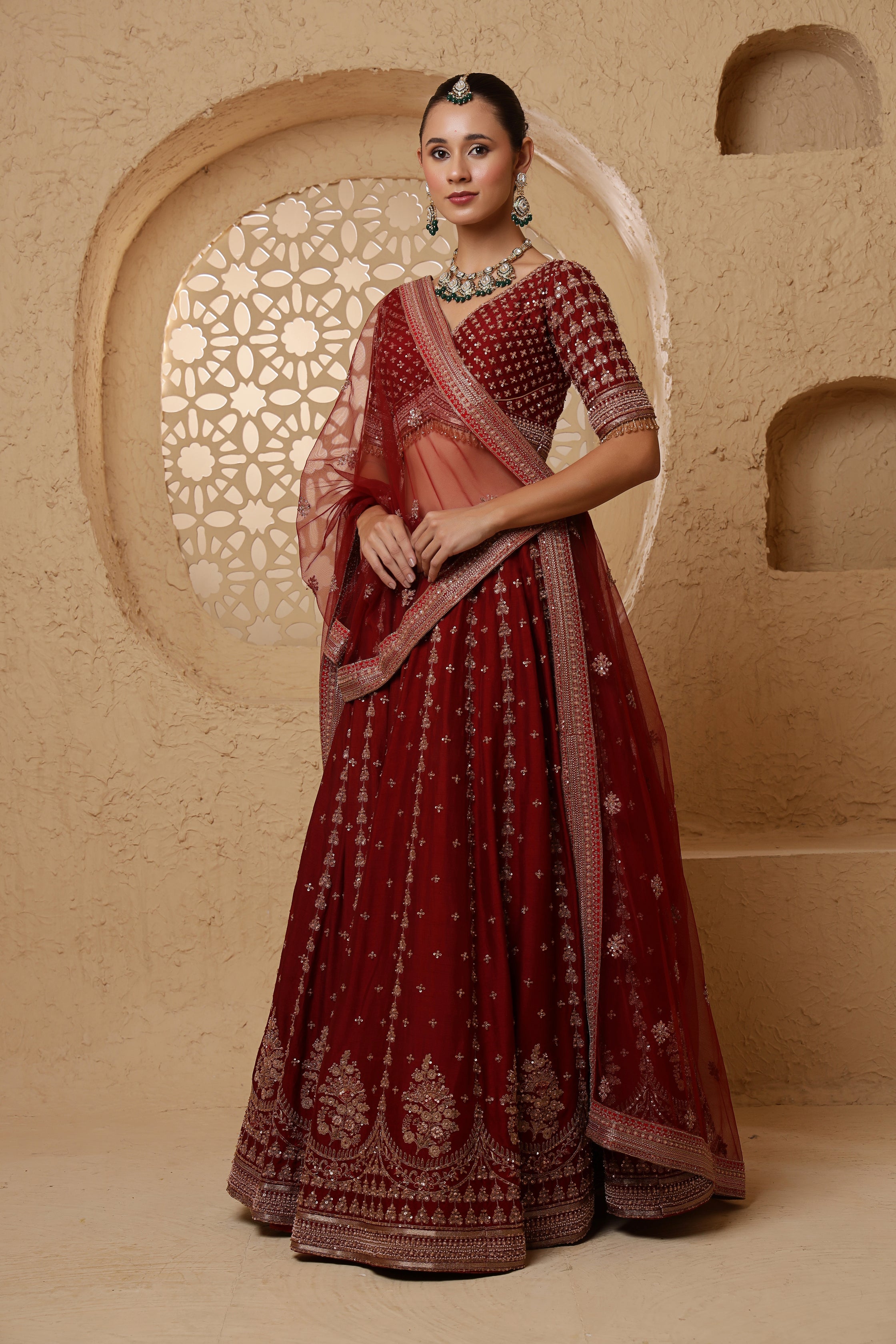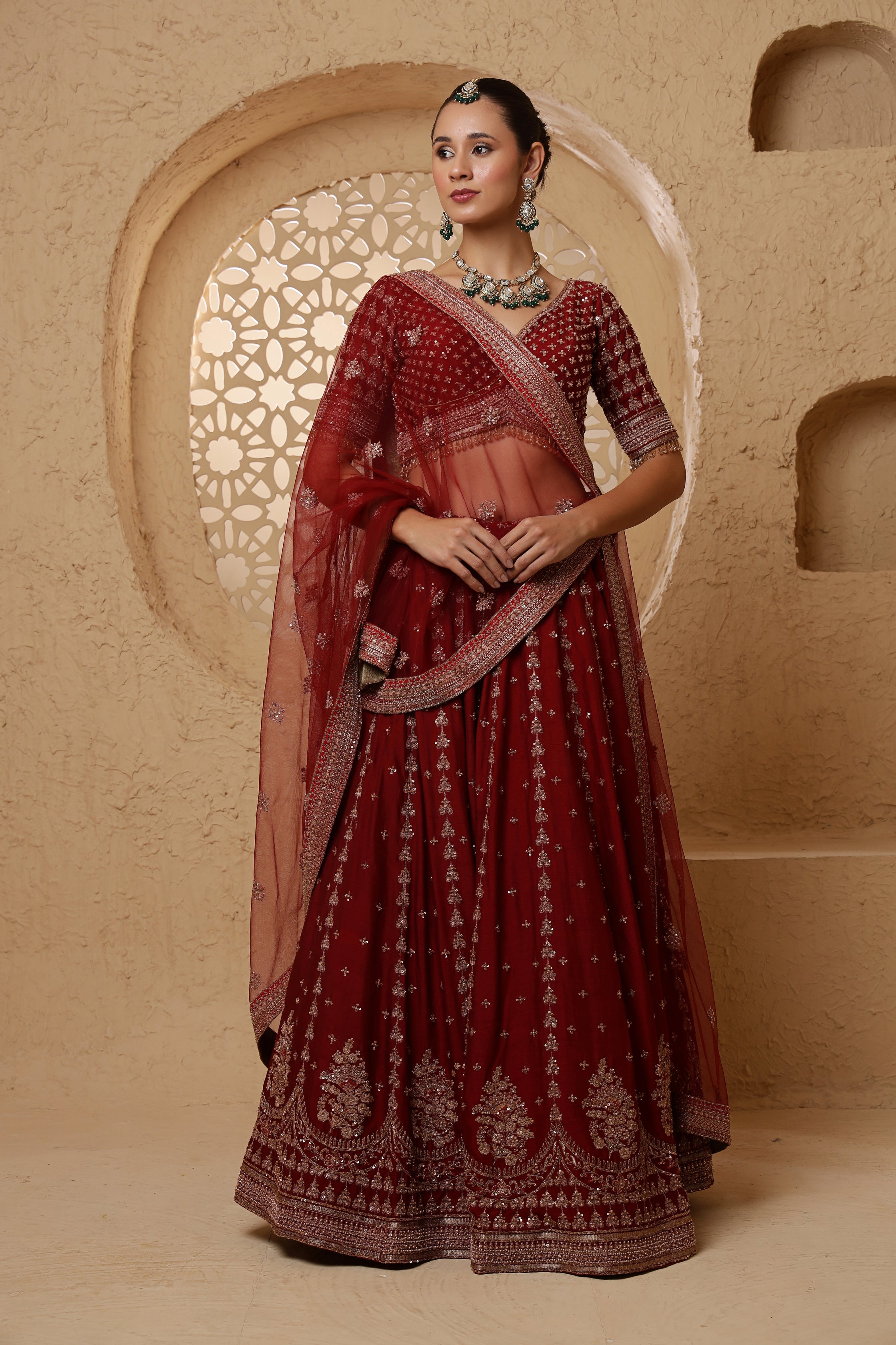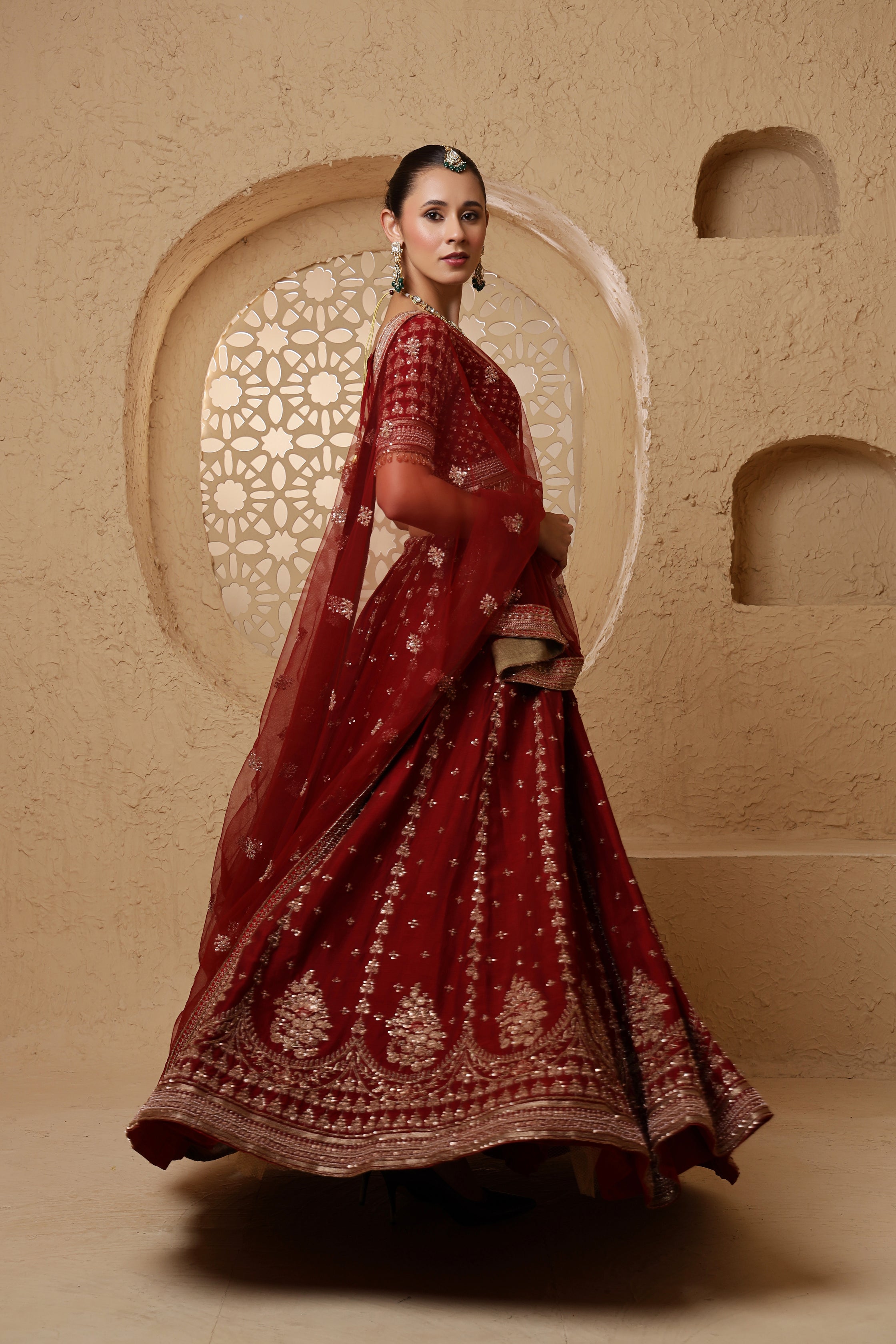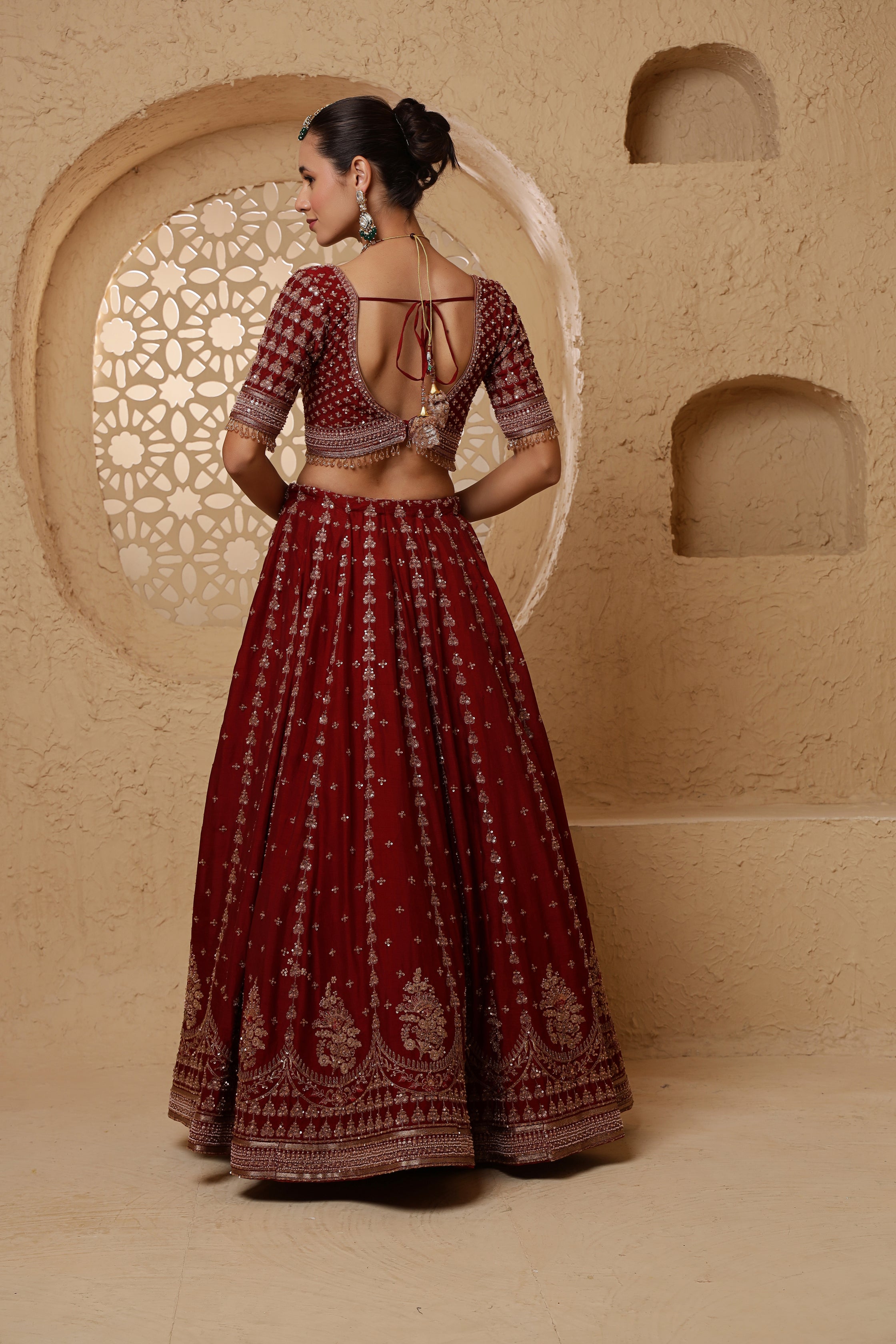 Stepped in timeless elegance, this deep maroon lehenga set is a perfect blend of tradition and grandeur. The voluminous lehenga is adorned with intricate hand-embroidered motifs, delicate silver threadwork, and beautifully placed buttas that cascade gracefully toward the hem. The ornate border adds an extra touch of regal opulence.