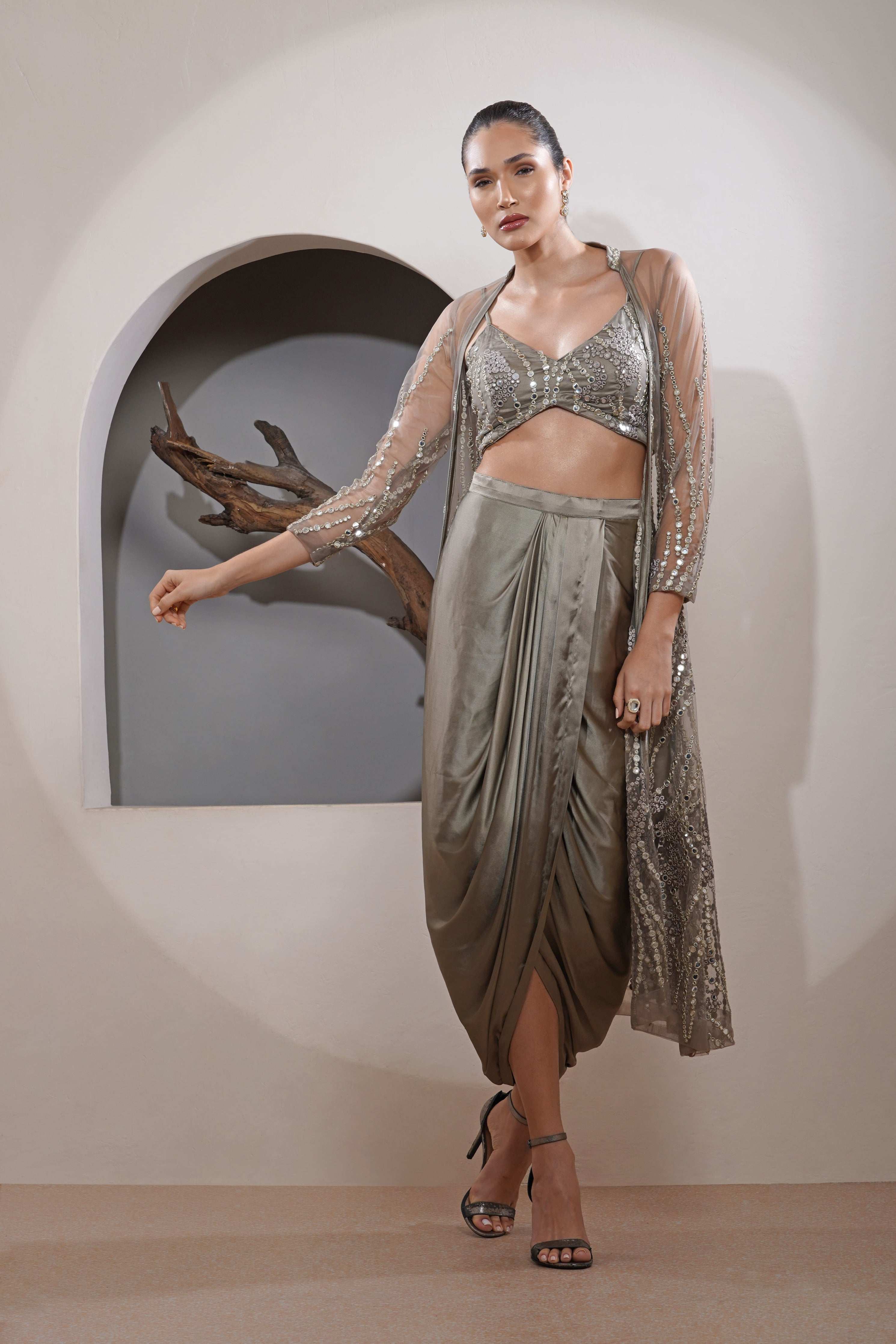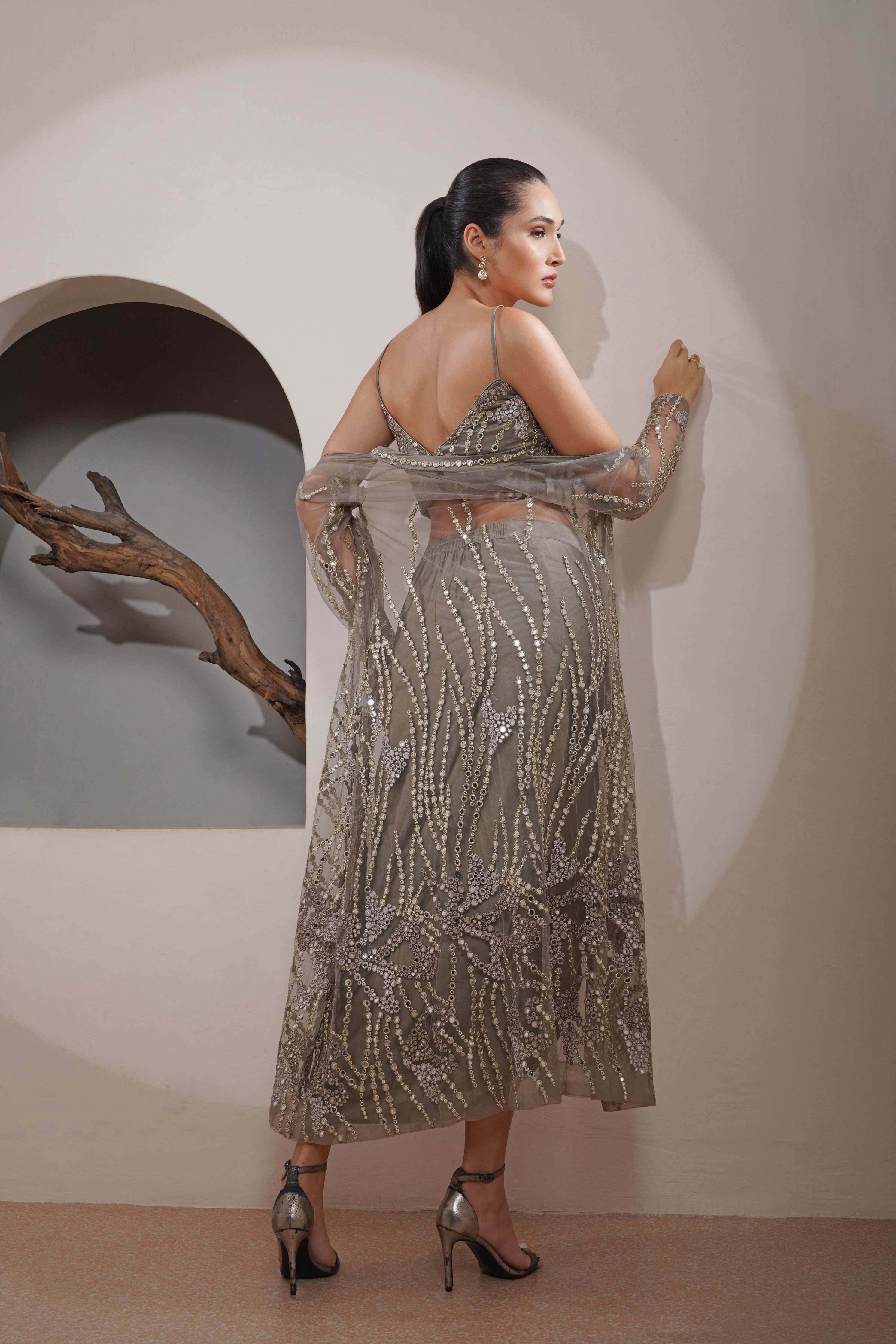 LONG CAPE AND BUSTIER  WITH ABSTRACT MIRROR AND ZARI EMBROIDERY  WITH SATIN DRAPE SKIRT