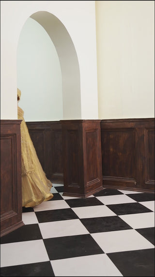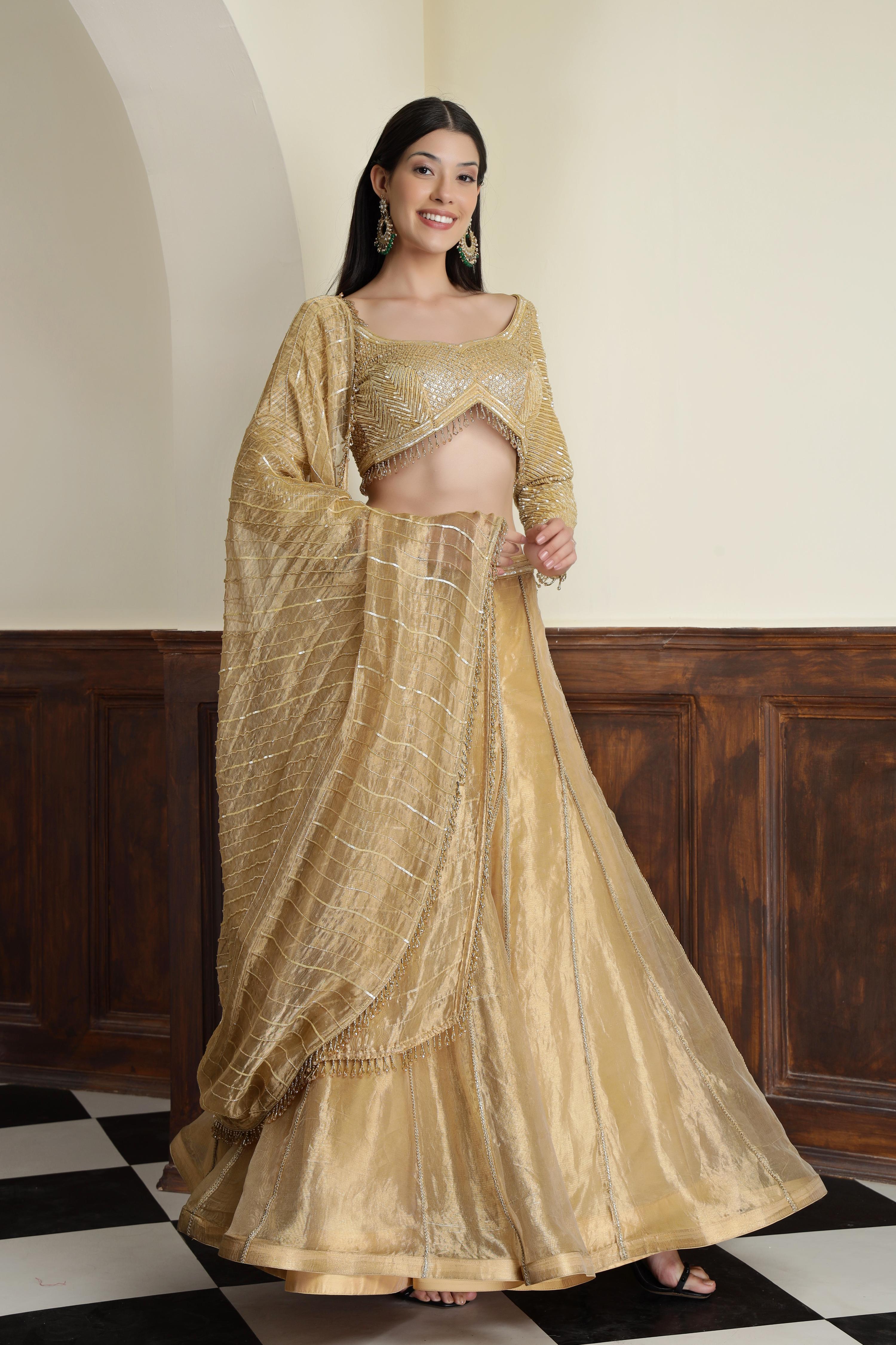 Elevate your festive wardrobe with this gold-toned embroidered lehenga choli set, designed in luxurious tissue fabric and adorned with delicate beads and stones. The set includes a fully stitched blouse, flared lehenga, and a matching dupatta with elegant tassel details.