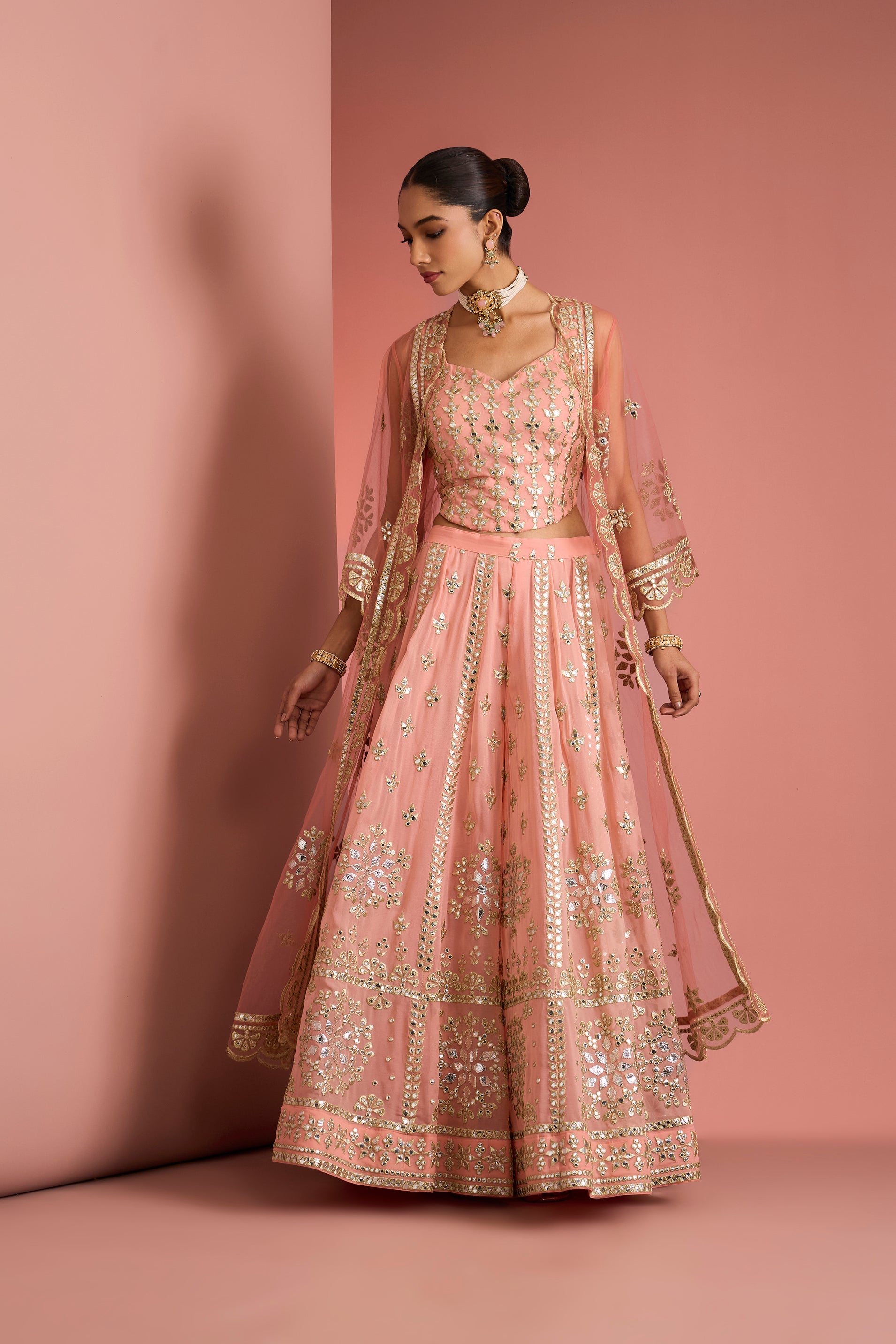 Radiating youthful elegance and festive charm, this peach mirrorwork lehenga is crafted for celebrations that call for effortless grace. The flared skirt is adorned with delicate mirror accents and fine thread embroidery arranged in neat vertical panels, creating a luminous rhythm that enhances movement and silhouette.