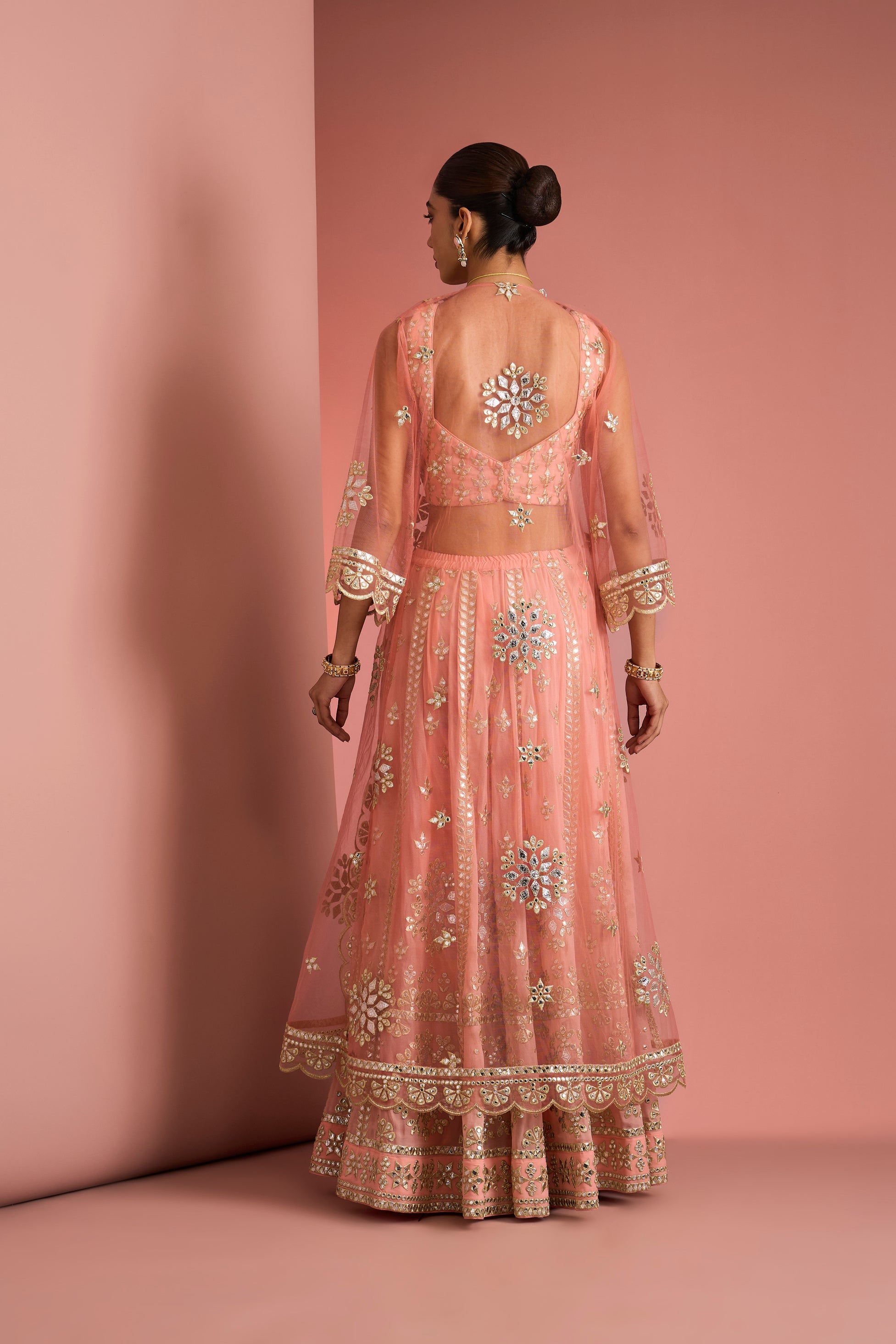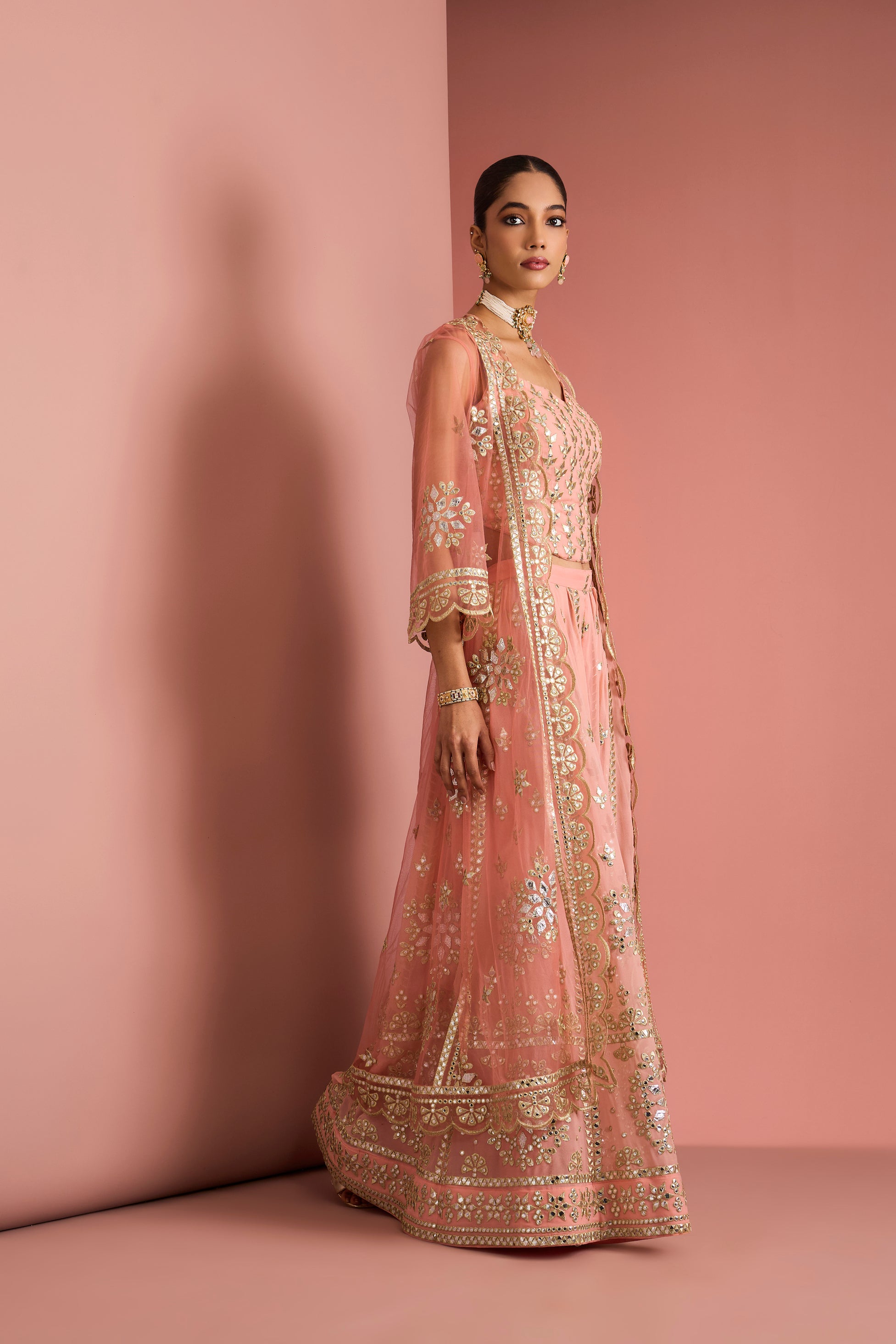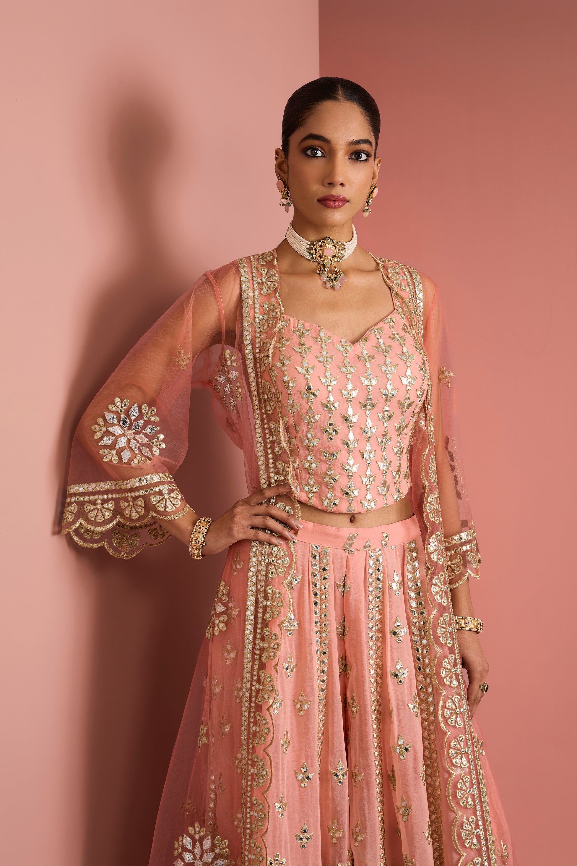 The coordinated blouse features intricate all-over embellishment with a flattering neckline, while the sheer peach dupatta is finished with embroidered borders and subtle motifs for a light, graceful drape. Soft yet striking, the harmonious blend of peach tones and reflective detailing makes this ensemble a perfect choice for mehendi ceremonies, festive gatherings, and modern bridal occasions.