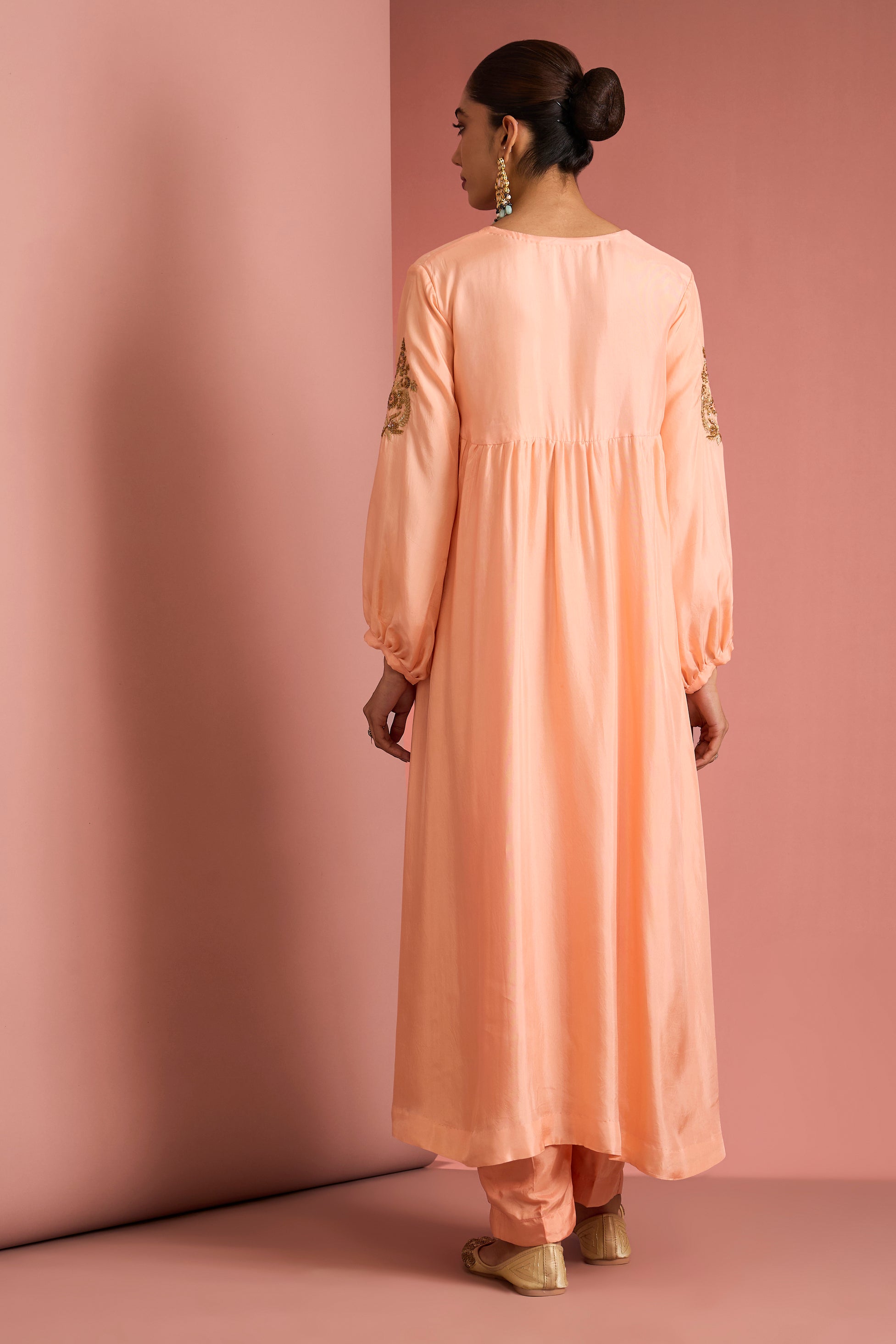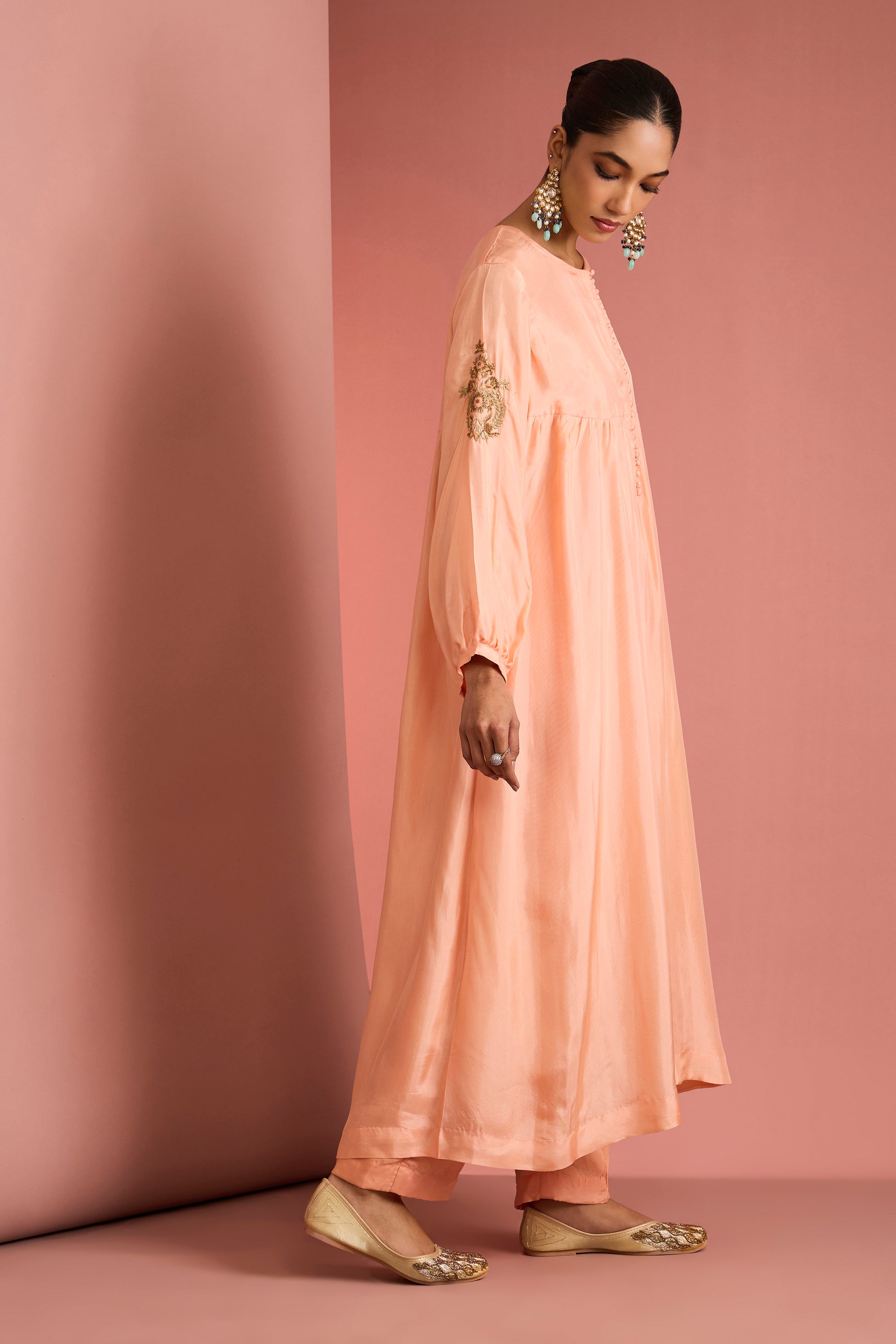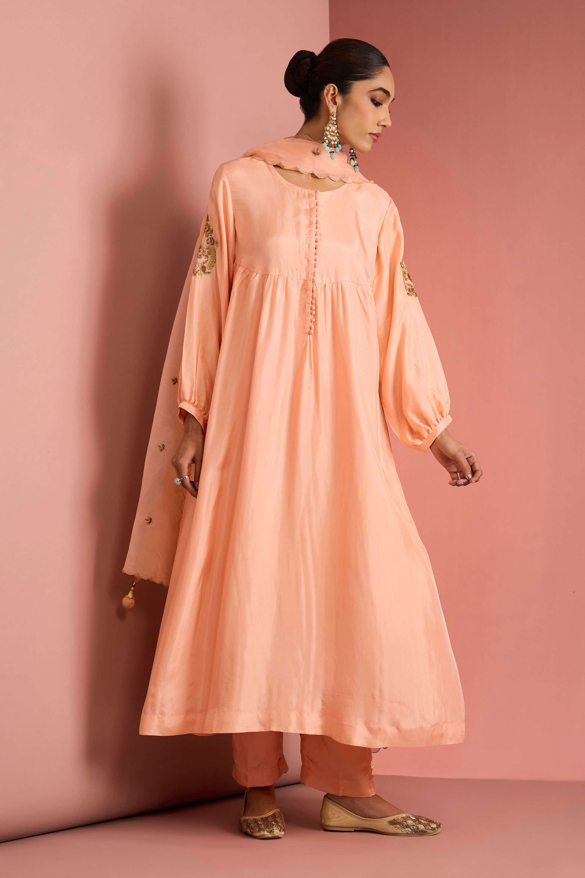 Soft, serene, and effortlessly graceful, the Peach Aarohi Embroidered Anarkali Set is a celebration of understated elegance. Crafted in a soothing peach hue, the flowing Anarkali silhouette features delicate gold-toned embroidery along the sleeves and subtle detailing that adds a refined festive touch. The relaxed fit is beautifully balanced with gentle gathers, fabric-covered buttons, and a matching dupatta finished with dainty tassels. Paired with straight-fit pants, this ensemble is perfect for intimate festivities, daytime celebrations, and elegant festive wear, offering comfort wrapped in timeless charm.