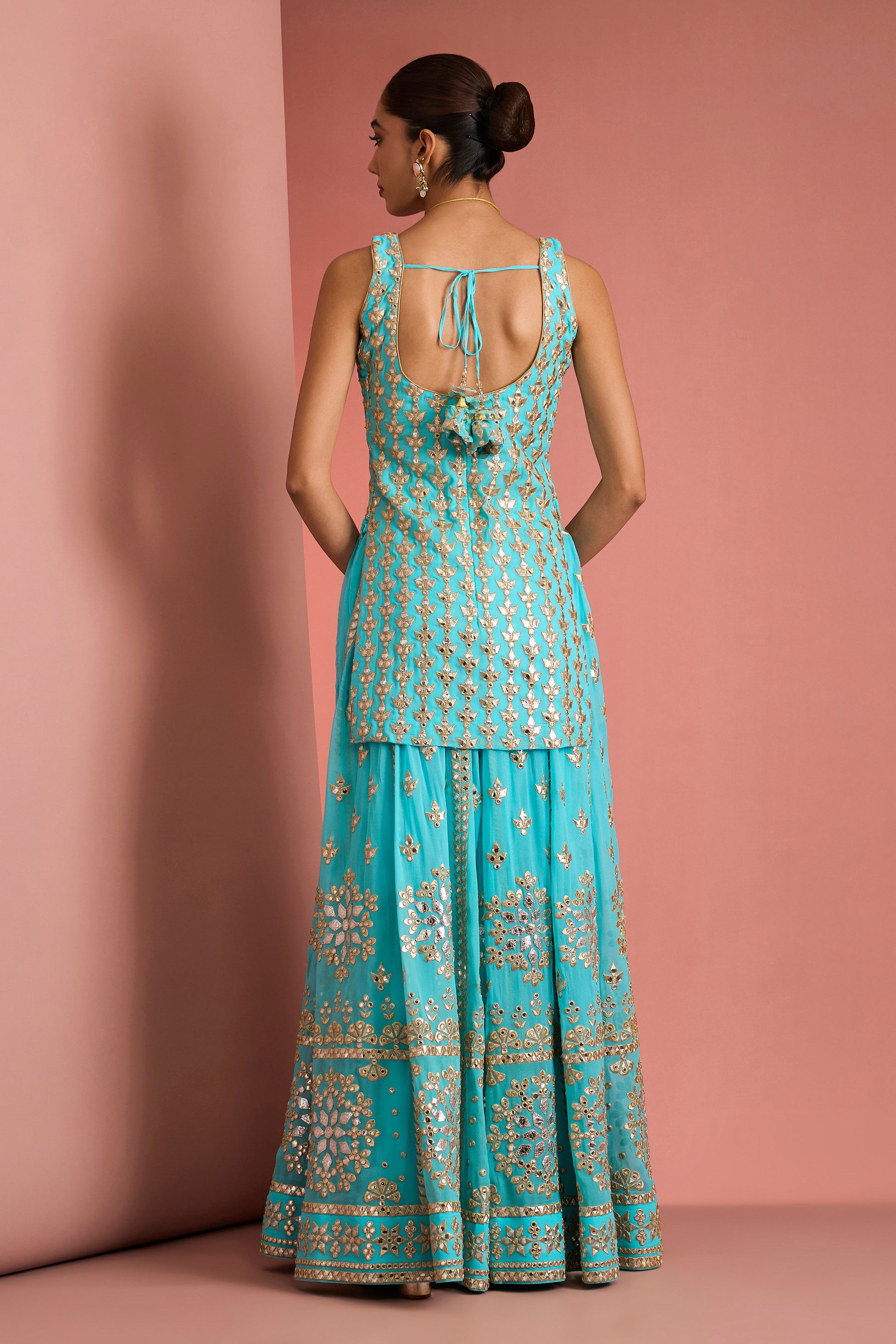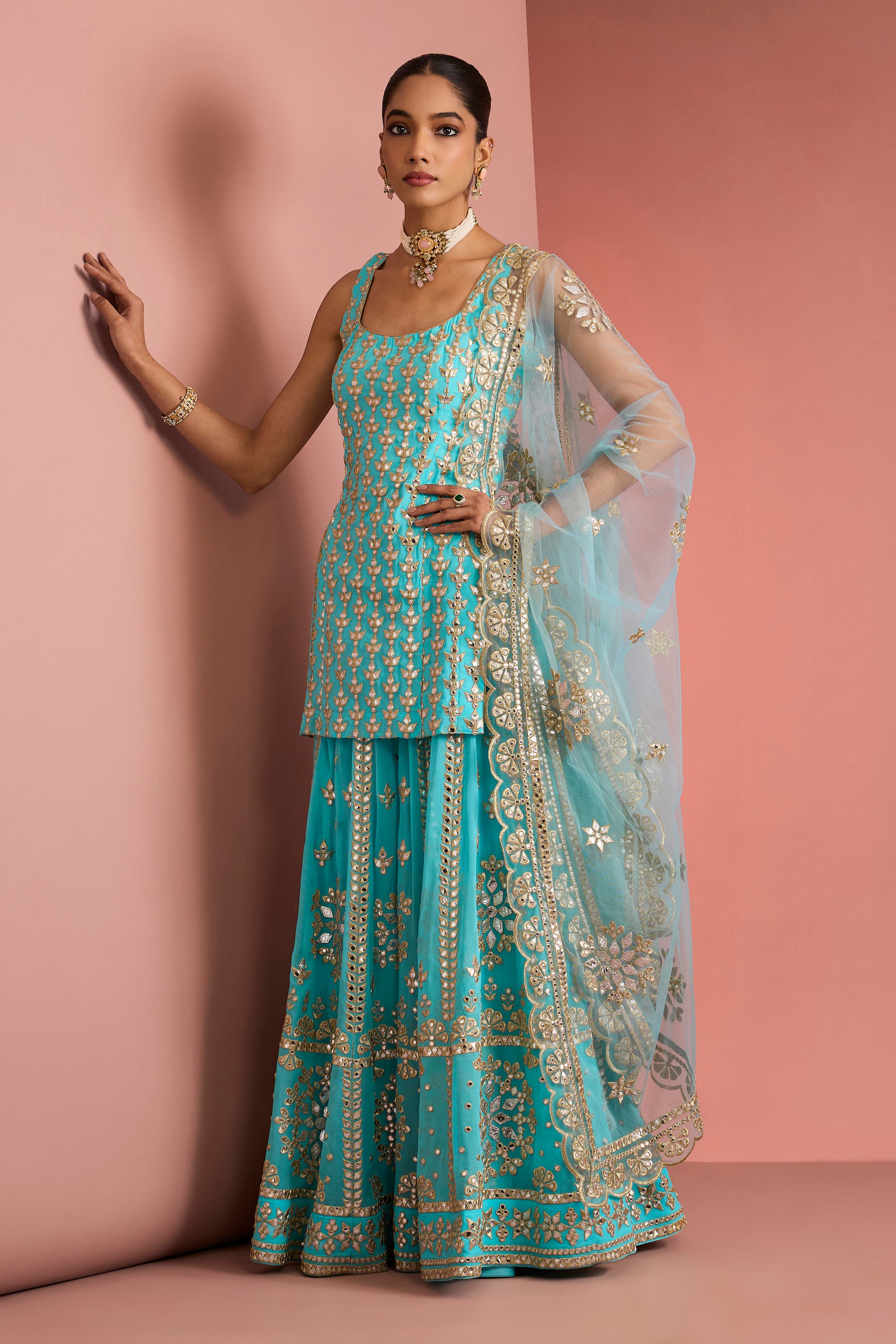 Radiating contemporary elegance, the Ziya Turquoise Sharara Set is designed for celebrations that call for effortless glamour. The sleeveless kurta is adorned with intricate all-over gold embroidery, lending a rich texture against the refreshing turquoise base.
